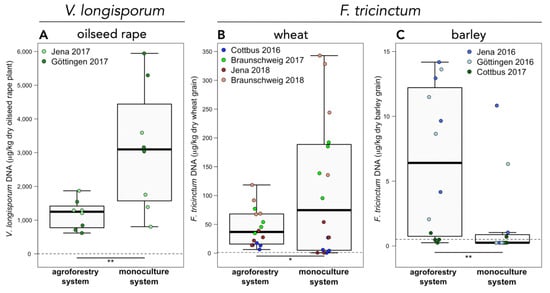 Beule, L.; Lehtsaar, E.; Rathgeb, A.; Karlovsky, P. Crop Diseases and Mycotoxin Accumulation in Temperate Agroforestry Systems. Sustainability 2019, 11, 2925. https://doi.org/10.3390/su11102925