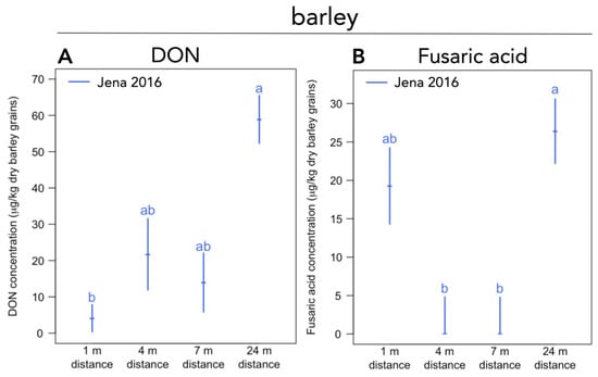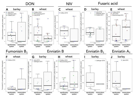 3.2. Mycotoxin Concentrations in Barley and Wheat Grain in Agroforestry versus Monoculture Systems