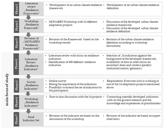MONARES (monitoring of adaptation measures and climate resilience in cities), a project funded by the German Federal Ministry of Education and Research (BMBF), was initiated in order to address the main challenges of (1) developing a consistent understanding of resilience for both practitioners and academia, (2) shaping the adaptation and transformation process into a transparent process of governing and steering and (3) the use of resilience and adaptation measurements. The aim of MONARES is to create application-oriented methodologies for monitoring and evaluating local adaptation measures. As we are focusing on the special needs for cities in Germany, we are working together with 14 other projects of the funding initiative “Climate resilience through action in cities and regions” of the BMBF, who are focusing on climate change adaptation measures and urban resilience, as well as doing on-the-ground research in municipalities across Germany. These projects and cities differ considerably concerning scale (street, district, city, suburbs and region), inhabitants and type of adaptation measure (e.g., planning, physical infrastructure, capacity building or greening). Important commonalities of the projects are their interdisciplinary approach, the aim to enhance urban climate resilience and that they conduct on-the-ground research. However, the projects test many different pathways to improve resilience, and MONARES is focusing on how to measure the success and impact of these different projects and activities with a common set of indicators. In order to ensure applicability, we began to involve the projects at an early stage of our research. The first key step (Figure 1 Phase 1) before developing the indicators was to develop a framework [15] to describe urban resilience. Based on 19 frameworks described in the literature [16,17,18,19,20,21,22,23,24,25,26,27,28,29,30,31,32,33,34], our first draft was developed, which then was modified together with the projects. This process was indispensable as it resulted in a definition of urban resilience that is suitable for all projects so that there was agreement on common basic principles.
