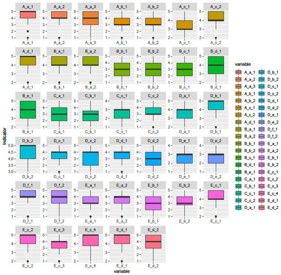 Box-plots of all indicators included in the survey (see Table 2 for indicator codes).