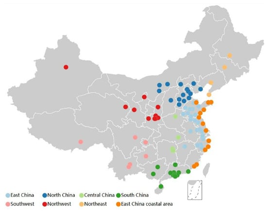 The chosen data are dated from December 2013 to November 2016. We defined an annual period as the time from December of one year to November of the next year. Geographically, our data cover 88 cities in China (Figure 1), and we divide these cities according to their geographical locations into 8 regions: North China, Central China, South China, Southwest, Northwest, Northeast, East China, and East China coastal area.