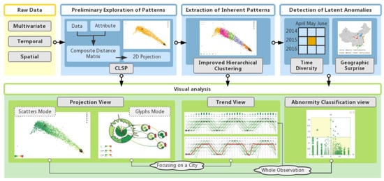 An increasing number of works have been devoted to the analysis of air quality data, but most of them have been limited to analyzing the patterns of only one major pollutant in a specific city or monitoring station because of the complexity, diversity and large volumes of data [2,3]. Determining the best approach to handling complicated air quality data to obtain multivariate temporal patterns and the relationships between different regions is a great challenge. The results of the analysis provide support for the pollution abatement of specific pollutants and areas. For example, AirVis [4] is a web-based visual analytic system that supports a collaborative analysis of spatiotemporal and multivariate features. However, it is implemented using only eight air quality monitoring stations in Beijing and is incapable of managing big data. Moreover, it is rare to find a study that focuses on detecting anomalies in air quality; for example, a particular city has a unique appearance compared with its adjacent locations, even if they have similar topographies and climate conditions. Obtaining divergent air quality data for a region despite other similarities to its neighbors can drive the analysis of air pollution causes and development of prevention measures. Furthermore, most of the previous works have obtained conclusions by computing isolated indicators [5,6], and the lack of meaningful contextual information has limited their further applications. Visual analytics is a new technology that makes up for this flaw. It is dedicated to transforming complex data into concise graphics that not only support the exploration of hidden patterns in the data but also assist in the comprehension of the patterns found. Thus, it is imperative to establish a comprehensive visual analysis platform that can analyze the regular patterns of air quality and potential anomalies. Such a technique helps the departments involved in environmental protection formulate effective policies to improve air quality; it even enables non-professional users to understand the patterns of air pollution.