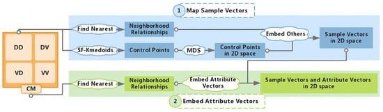 On the basis of the composite distance matrix, we map samples and attributes into visual space. In contrast to the data sets in the data context map [25], air quality data are characterized by having a sample number that is much larger than the number of attributes, and stores less information than and . To ensure that the accuracy of and is maintained as much as possible in the projection layout, we adopt two mapping steps: we map the samples first and then embed the attributes into the samples layout. Figure 3 shows the pipeline of the whole projection process.