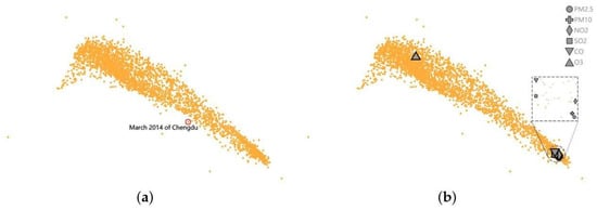In this step, we utilize the Least Square Projection (LSP) [37], which is efficient for large data sets. The core process of LSP is mapping a representative subset first and then efficiently embedding others into the subset layout. To select a subset that best represents the original distribution, we use the SF-Kmedoids algorithm [38] on the basis of submatrix to split the samples into multiple clusters and define the centroid of each cluster as a control point. Then, the classical MDS algorithm [20] is applied to map them into 2D space. Since each point is located in the convex hull of its neighboring points, we embed other samples into the layout of the control points according to the neighborhood relationship among all samples. The projection results of samples are shown in Figure 4a, which was obtained using the air quality data analyzed in this paper. Each orange point represents a sample, and the Chengdu sample in March 2014 is marked in the figure.