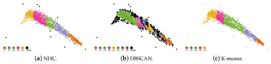 Figure 5 shows a comparison between our NHC method, DBSCAN, and K-means. The colors of the points encode cluster labels, and the black points represent noises. To highlight the noises, we set a larger radius for them than other clustered points. In the NHC process, we set to 200; in the DBSCAN process, we set the minimum number of points required to form a dense region to 4 and the radius to 0.15; and in the K-means process, we set the number of clusters to 5. From Figure 5a,b, it can be observed that our method separates the clusters more elaborately when the points are intensive. As shown in Figure 5a,c, the noises are separated from the regular patterns and highlighted in our method. Thus, NHC performs better when dealing with uneven data distributions.