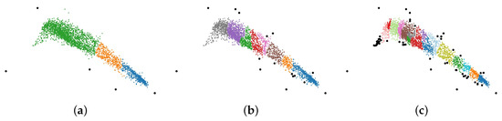 According to Algorithm 1, is the threshold to control the maximum number of points in a cluster. We can adjust the parameter to obtain different clustering results. Figure 6 shows the results of NHC by setting to different values. In Figure 6a, most points are grouped into three clusters, which are marked by green, yellow, and blue. Compared with Figure 5a, in which is 200, we find that the green cluster in Figure 6a is a combination of three small clusters in Figure 5a. In Figure 6b,c, the points are further divided into more clusters, and more noises are separated. Thus, we can conclude that the smaller the value, the more clusters and more noises we get.