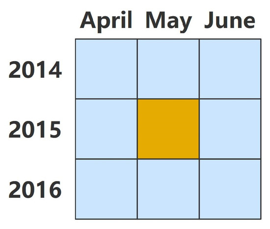 Considering periodic variations, we define the time neighborhood of sample as , where is the number of neighboring timestamps of . In this paper, is set to 8: the previous month, the next month, and these three months in the two adjacent years. Figure 7 shows the time neighborhood of May 2015; the orange grid represents May 2015 and the blue grids represent neighboring timestamps. From the clustering results in Section 4.2, the TD of each month is computed as