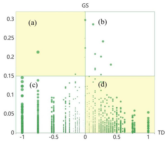 In Equation (3), represents the cluster that sample belongs to, while is the cluster label of . For all samples in , is the number of samples belonging to , and is the number of samples belonging to . is a real number in the range [−1, 1]. The closer the value of is to −1, the more likely that and its time neighborhood belong to the same cluster and vice versa. Hence, the higher the TD of a sample point, the more abnormal the air quality in that month.