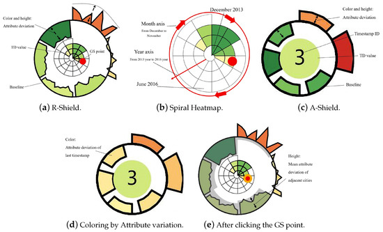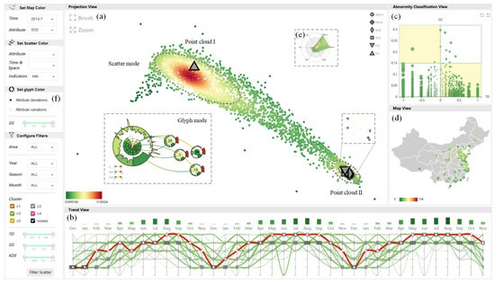 In order to assist users in finding temporal anomalies, Muelder et al. [27] portrayed the behaviors of compute nodes over time by applying a force-directed layout that aggregated similar patterns and distinguished abnormal timelines. Similarly, Xu et al. [28] introduced a time-aware outlier-preserving technique to extend Marey’s graph and achieved effective anomaly detection in manufacturing processes. Unlike the approaches that focus on a time axis, Shi et al. [29] linked two time-slots in a projection view in a method that supported the analysis of temporal evolution and multivariate features of different items. Cao et al. [30] designed glyphs with a time arc to detect anomalous users in social media data. For a deeper analysis of spatiotemporal anomalies, several visual analytic systems have been developed [31,32]. For example, a visual analytic system named Voila, developed by Cao et al. [33], achieved an interactive anomaly detection performance through a tensor-based unsupervised algorithm that analyzed the current spatiotemporal state by incorporating the historical states.