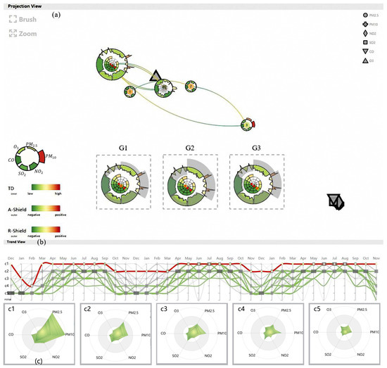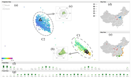 To confirm this, he brought up the highlighted trend view (Figure 14b) to explore the degree of anomalous geographical conditions over the entire timeline. Observing this view presents a satisfactory result: even though all city lines have similar variation trends, the line for Ordos is always above the others, especially in winter. He further combined the analysis with the radar chart (Figure 14c) and found that the cluster labels at the top of the trend view have higher pollution values. Therefore, he ultimately drew the conclusion that the air in Ordos remains clean in the long term and is better than that in other cities in the same area.