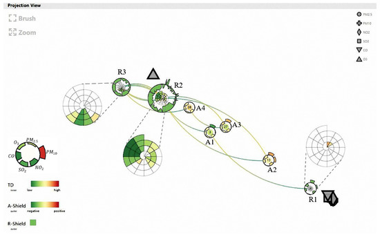 As a common type of data collected by sensors, air quality data have attracted the attention of many scholars. Most works have comprised time-varying analysis and regional research. Du et al. [11] proposed an adaptive multiscale trend view that could flexibly reveal the linear and periodical temporal patterns of air quality. Similarly, Li et al. [12] integrated the variations in multiple pollutants. They also studied the various air quality features in time and space and designed Global Distribution View, which jointly visualizes the spatiotemporal and clustering information in a neat form. Through even deeper analysis, Zhou et al. [13] illustrated how spatial clusters changed over different time scales and used a storyline design to depict evolving changes for different locations. Another essential requirement for the visual analysis of air quality consists of correlation detection. The Time-Correlation-Partitioning (TCP) tree [14] presented a novel visual representation that concisely describes both the variable hierarchy and the temporal variation in correlations hidden in air quality data. Qu et al. [15] not only considered the correlation between different kinds of pollutants but also accounted for the influence of weather data on air conditions.