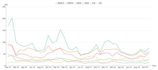 The data used in this research are fetched from a weather website (http://www.tianqihoubao.com/aqi) that releases air quality monitoring data in China. The website contains daily data for different cities and records six kinds of major air pollutants, namely, , , , , , and . After data cleaning, we compute the Individual Air Quality Index (IAQI) for each pollutant using its concentration. Moreover, the Air Quality Index (AQI) of each piece of data is defined as the max IAQI.