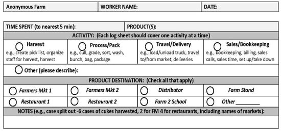 To collect the marketing labor data, farm staff—including owners, hired staff, unpaid family members, and volunteers—completed labor logs each day (see Figure 1) during the study week. We categorized each tracked item (labor, mileage, or sales) by marketing channel in order to assess the costs and returns of each specific channel. For larger-scale operations with H2A crews (non-immigrant, temporary foreign workers), we classified the entire crew as a single group of employees, as they are paid similar rates to perform similar tasks. In this case, we asked the manager of the crew to complete the labor logs.