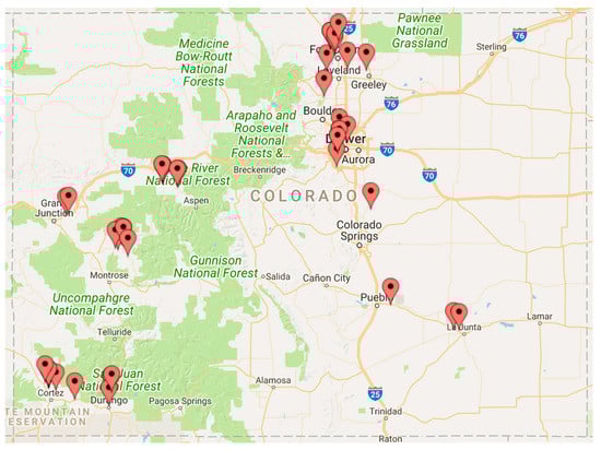 - U.S. Department of Agriculture Census of Agriculture (USDA NASS). Table 2: Market Value of Agricultural Products Sold Including Direct Sales: 2012 and 2007; Department of Agriculture: Washington, DC, USA, 2012. Available online: https://www.nass.usda.gov/Publications/AgCensus/2012/Full_Report/Volume_1,_Chapter_2_County_Level/Colorado/st08_2_002_002.pdf (accessed on 22 April 2019).
