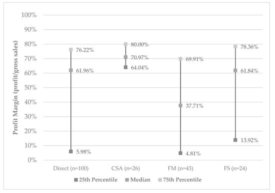 Although there have been recent research efforts quantifying the profitability impacts of sales through local food markets [,,], this body of work merely divides local food markets into two categories (i.e., direct-to-consumer or intermediated sales) due to data constraints. However, a handful of localized case studies provide evidence of the variability of cost structures within direct markets, particularly due to labor [,,,]. Low et al. [] highlighted that within-market differences may be related to the different levels of financial commitment required for CSA membership, compared to shopping at farmers markets.