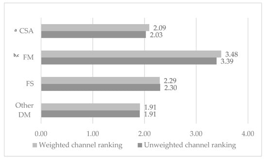 Evaluation of risk and reward of market channel engagement. Superscripts on the figure above denote statistical differences in means, where tests were based on pairwise comparisons. The codes defined in the footnote below indicate significant differences between direct market channels and are the findings from combinations of pairwise tests. a CSA and FM, b FM and FS, c FM and Other DM.