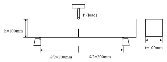 The fracture toughness was determined with the precracked three-point bending beam concrete specimens shown in Figure 1, and each specimen had a length (L) of 515 mm, a thickness (t) of 100 mm, a height (h) of 100 mm, and a span (S) of 400 mm, with single-edge crack prefabricated, which had a crack angle of 0°, and a crack tip opening angle of 15°. The prefabricated crack had a depth of = 50 mm, a width of 3 mm, and the ratio of the crack depth to the specimen height was . The prefabricated crack was formed through an embedded steel plate. Before concrete pouring, both sides of a steel plate were applied with mold release agent; after initial setting of the concrete in 3 h, the steel plate was pulled out to form a prefabricated crack.