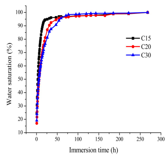 Figure 2 shows the curves of water saturation versus immersion time for C15, C20, and C30 concrete specimens, and it can be seen from Figure 2 that, for all experimental groups A, B, and C, the water saturation increased with the increase in immersion time. When the immersion time was 0–72 h, the lower the strength grade, the faster the increase in speed of the water saturation, and under the same immersion time condition, the lower the strength grade, the higher the water saturation; for example, when the immersion time was 24 h, the water saturation of C15 concrete was 1.09 times that of C20 concrete and 1.17 times that of C30 concrete. When the immersion time reached 72 h, the water saturations of C15, C20, and C30 had reached 96.88%, 96.59%, and 97.70%, respectively; with a further increase in immersion time, the increase speed of water saturation turned slower. When the immersion time reached 270 h, the average water absorption rate of the specimens was less than 1 g/h in all groups A, B, and C, and the specimens had reached saturated state. The water absorption process of concrete is complex and slow, and absolute saturation cannot be achieved within a short time, so the saturated state defined in this paper is the approximately-saturated state.