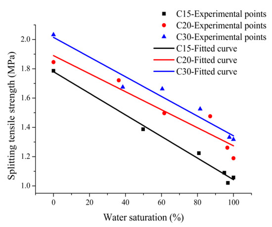 As can be seen from Figure 4 and Figure 5, the experimental values and fitted curves of the compressive strength and splitting tensile strength of concrete versus water saturation fit well, the fitting Equations (2) and (3) have a good correlation, and can be used to predict the strengths of concrete at different water saturations. Both compressive strength and splitting tensile strength of C15, C20, and C30 concrete specimens exhibit an approximately linearly decreasing trend with the increase in water saturation. Given the same water saturation, the lower the strength grade of concrete, the larger the decrease magnitudes of compressive strength and splitting tensile strength. For example, when all concrete specimens were in their water-saturated state, the compressive strengths of C15, C20, and C30 concrete specimens decreased by 40.08%, 34.65%, and 32.23%, respectively, and the splitting tensile strengths decreased by 40.80%, 35.57%, and 35.17%, respectively, compared with the experimental groups in the dry state. Wittman et al. [9] found through study that the compressive strength of saturated concrete decreased by 33.79%, compared with dry concrete, and Reinhard et al. [7] obtained through study that the tensile strength of saturated concrete was only 75% of that of dry concrete; this paper makes conclusions consistent with the those above, but the decrease magnitudes differ somewhat from the above conclusions due to the different definitions of dry state and approximately water-saturated state of concrete, and different experimental conditions, including strength level, aggregate type, and mix proportion.
