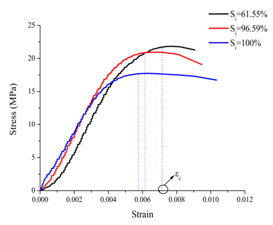 With the C20 concrete specimen groups (B2, B4, and B5) as examples, the regularities of influence of the water saturation on the uniaxial compressive stress-strain relationship of concrete were analyzed; only the ascending part and partial descending part of the stress-strain relationship curves were obtained, due to the limitations of experimental instruments; Figure 6 gives the uniaxial compressive stress-strain relationship curves of concrete versus water saturation. As can be seen from Figure 6, the higher the water saturation of concrete, the larger the slope of the ascending part of the stress-strain curve and the smaller the peak stress, indicating that any ingress of water causes the elastic modulus of concrete to increase, and the compressive strength to decrease. The higher the water saturation, the smaller the peak strain (εc) corresponding to peak stress; for example, the peak strain of water-saturated concrete specimens in experimental group (B5) was only 80.78% of that of concrete specimens with a water saturation of 61.55% in experimental group (B2)—in other words, the increase in water saturation caused the concrete to become brittle, and its deformation capacity to decrease.