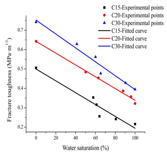 According to the experimental data shown in Table 5, prediction Equations (5), (6) and (7) for fracture toughness of C15, C20, C30 concrete relative to water saturation were fitted, and the correlation coefficients were 0.93, 0.99, and 0.97, respectively.