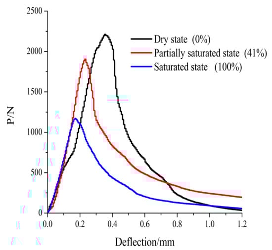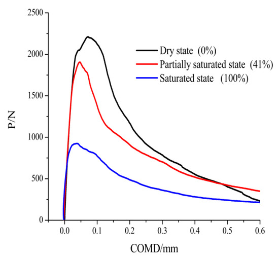 As can be seen from Figure 8; Figure 9, the slopes of the ascending parts of P-CMOD and the P-deflection curves in the experimental group (C0) of dry concrete are the smallest, and increase gradually with an increasing water saturation. The CMOD and loading point deflection, corresponding to the critical load for fast crack propagation, are written as COMDC and YC in short, respectively, and both CMODC and YC exhibit a decreasing trend with the increase in water saturation. For example, the CMODC, and YC are 0.030 mm and 0.189 mm, respectively, in the experimental group (C5) in the water-saturated state, and 0.0721 mm and 0.353 mm, respectively, in the experimental group (C0) in dry state, and the CMODC and YC in the experimental group in water-saturated state decreased by 58.39% and 30.65%, respectively, compared with those in the experimental group in dry state. Under the same CMOD and deflection conditions, the higher the water saturation of a specimen, the smaller the tolerable load; for example, when the CMOD was 0.050 mm, the tolerable load of a specimen was 2072 N in the experimental group (C0) in dry state, whereas the tolerable load was 886 N in the experimental group (C5) in approximately-saturated state, decreasing by 57.2% compared with the load in dry state.
