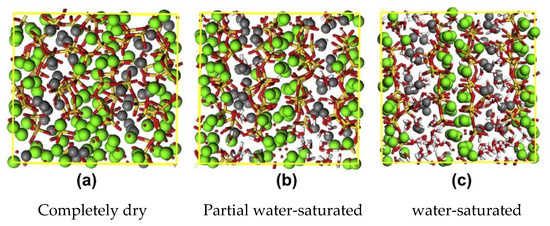 The decrease in strength of wet concrete can be interpreted from the perspective of energy, the work done by external force during the generation, convergence and extension of cracks in concrete needs to overcome the surface energy forming microcracks. After water permeates into concrete, it reduces the van der Waals forces between the microscopic particles of materials, and weakens the cohesion among the particles of concrete, so that the surface energy is reduced, and then the energy needed to form new fracture planes is decreased, and the work done by any external force for extension of initial cracks is less, macroscopically exhibiting a decrease in strength and fracture toughness [18,19,20,21,22,23,24,25,26,27,28,29,30,31]. The other kind of interpretation is that the fracture and failure of concrete start from the interfacial transition zone between aggregate and mortar first, the main hydration product of the cement mortar in the transition zone is C–S–H, whose volume percentage is about 60–70% and whose strength and fracture property directly dictate the macroscopic mechanical properties of concrete. The molecular structure diagrams of C–S–H at different water saturations were given [32], and the mechanism of the damage effect of water absorption rate on the mechanical properties of concrete was interpreted from the perspective of molecular dynamics, as shown in Figure10.