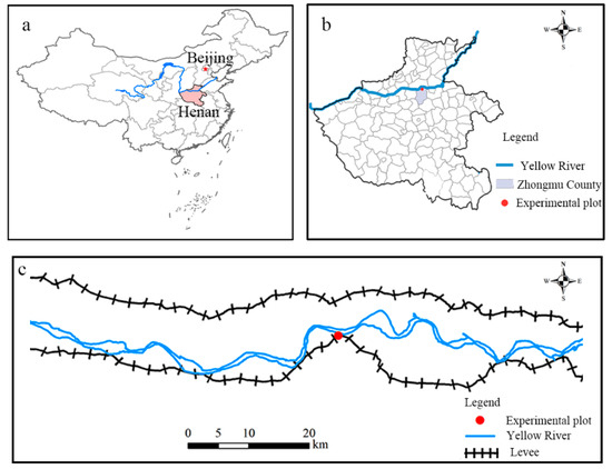 The climate of the experimental site is a typical warm temperate continental monsoon climate, characterized by mild windy springs (April–June), hot rainy summers (July–September), and cool dry autumns and winters (October–March) [30]. The mean annual temperature is 14.2 °C, and the maximum and minimum monthly temperatures occur in July and January, respectively. Rainfall is strongly seasonal and mostly occurs in summer and autumn, with considerable annual variation and uneven spatial distribution. Annual precipitation is 616 mm. In recent years, the number of rainy days has decreased, heavy rain fall has increased, and drought and flood disasters have become more common [31]. Soils in the study area are dominated by fluvo-aquic and yellow cinnamon soils, which contain much sub-sand and silt-sand due to historical floods of the Yellow River. In addition to floods, climatic characteristics, soil and water sources, and especially the frequent human interventions such as agricultural planting and tourism development, have led to serious damage to the vegetation in the riparian zone and degradation of soil and water quality. The dominant plant species in the study area include willow (Salix babylonica L.), aspen (Populus L.), and grass (Setaria viridis (L.) Beauv.) [30,31]. The main agricultural crops are wheat (Triticum aestivum L.) and maize (Zea mays L.).