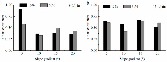 As expected, runoff coefficients under the 15 L/min flow rate were larger than under the 9 L/min flow rate. Moreover, the runoff coefficient was higher at 15% vegetation cover than at 30% vegetation cover in most treatments with shallow slopes (5° and 10°), indicating that increasing the vegetation cover can moderate the runoff generation.
