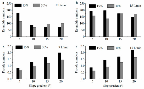 Variation in flow regime (Reynolds—(a) and (b) and Froude numbers—(c) and (d)) under four slope gradients, two vegetation cover levels, and two flow rates for a runoff scouring experiment in the lower Yellow River, China.