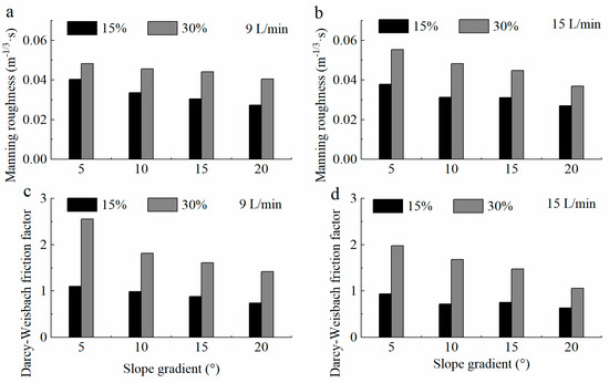 The Darcy–Weisbach friction coefficient (f) was similar to n (Figure 5). Its range was from 0.633–1.102 at the 15% vegetation cover and 1.059–2.555 at the 30% vegetation cover treatment, so f was higher with greater vegetation cover. Additionally, f decreased with an increasing slope gradient, but only on slopes with 30% vegetation cover where f was much higher at shallow slope gradients than on the 15% vegetation cover plots.