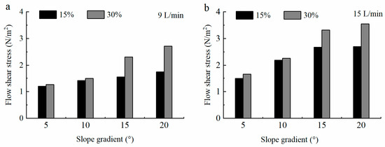 Variation in runoff shear stress under four slope gradients, two vegetation cover levels, and two flow rates for a runoff scouring experiment in the lower Yellow River, China. Flow shear stress under the 9 L/min flow rate (a) were less than under the 15 L/min flow rate (b).