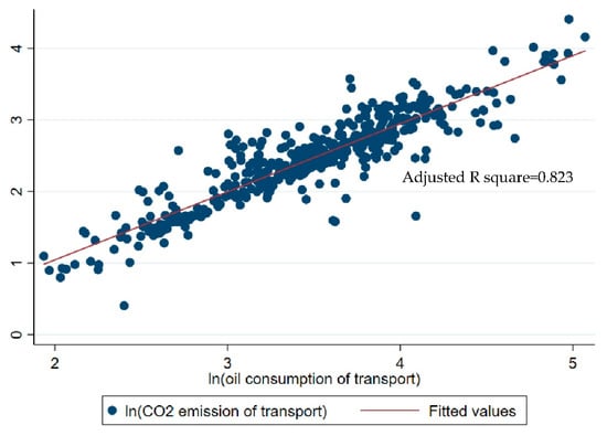 As shown in Figure 1, the natural logarithm of CO2 emissions of transport is highly correlated with the natural logarithms of oil consumption of transport, and the adjusted R square is 0.823. Although there is a strong linear correlation between CO2 emissions and oil consumption, they are not interchangeable. Combined with Table 1 and Table 2, it can be preliminarily concluded that the addition of an energy consumption indicator significantly affects the ELPI scores of some countries, such as Venezuela, RB.