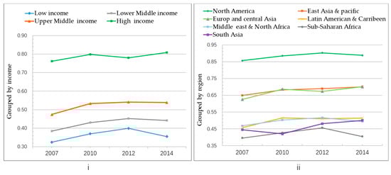 Similarly, the annual average ELPI scores are calculated in region groups during 2007–2014, to analyze whether there is a significant difference in ELPI scores in each regional group. As shown in graph ii of Figure 2, the average scores of ELPI have significant hierarchical differentiation in each region. It is worth noting that the gap in average ELPI scores across all regions narrowed in 2014, except for Sub-Saharan Africa.