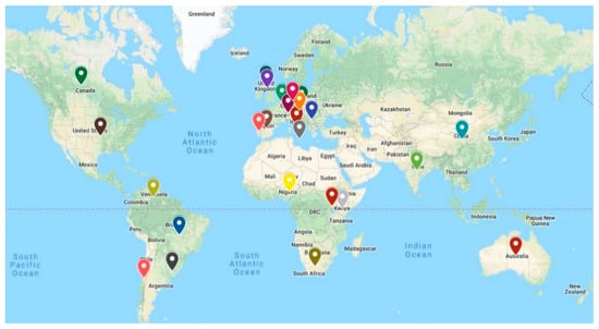 A total of 237 questionnaires were received from 51 countries around the world. Most respondents are from the United Kingdom (n = 52), the United States (n = 33), Brazil (n = 23), Portugal (n = 12) and Australia (n = 10). All responses were divided into six separate groups according to the region where the university is located. The most represented region was Europe with 43% of the replies, followed by South America (21%), North America (16%), Africa (10%), Asia (5%) and Oceania with 5% of all the replies. Figure 1 shows the countries participating in the study.