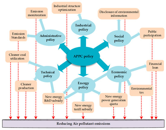 Since 2013, the number of air pollution incidents in China has been frequent, and the air quality has been getting worse [43]. Normally, air pollutants consist of primary particles directly discharged from coal, motor vehicles, dust and biomass burning, and secondary particles obtained by complex chemical reactions of pollutants such as sulfur dioxide, nitrogen oxides, volatile organic compounds and ozone in the air [44]. The main sources of air pollutants in China are coal-fired power plants, industrial production processes and motor vehicles. In the past a long time, the main pollutant affecting China’s air quality is sulfur dioxide. However, with the in-depth implementation of energy-saving and emission reduction reforms for large-scale coal-fired power plants and the rapid increase in motor vehicles, ozone has replaced sulfur dioxide as the primary air pollutant in China [45]. In 2016, almost all air pollutants emissions in China ranked first in the world [46]. In this context, China has introduced a series of APPC policies aiming at reducing the level of air pollution.