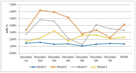 According to Table 10 and Figure 6, combined with the selected model scheme settings, several findings can be concluded: (1) Considering the influence of APPC measures can improve the prediction accuracy of the model. According to the comparison of models 1 and model 2, the prediction error of model 1 for each sample day to be predicted is smaller than that of model 2, and the average error of model 2 is the largest among the four models, indicating that the short-term load forecasting results of the city have significantly affected by APPC measures. Therefore, considering this impact can effectively improve the accuracy of short-term load forecasting.