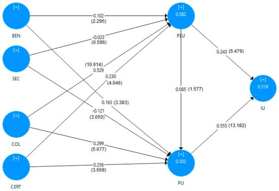 The primary narrative of TAM is that an individual’s internal convictions, with respect to ease of use and usefulness of any given technology, are the deciding factors in actual usage. PU has been studied as a potential customer’s subjective opinion about the utility of a specific technology, which in turn possibly leads to fulfill individual objectives []. PEU is included as an exogenous variable which has an indirect affect on attitude towards use or intention to use via PU, which has proven in numerous studies to have a direct affect on attitude and is a direct determinant of continued information systems IS usage intentions [,]. This study hypothesizes a significant path from PEU to PU and from PEU to IU. Intention to use a DSS is modeled as a resulting construct predicted by PU and PEU.