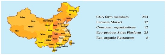 In 2015, the 6th International Community-Supported Agriculture Conference “landed” in Beijing, reflecting that China has become an important country in the world to study and practice the CSA concept [11]. According to the statistics from CSA Alliance of Socio-ecological Agriculture in China, there are more than 300 projects in operation (including 254 CSA farms, 32 famer markets, 12 customer organizations, 25 eco-product sales platforms and so on) in more than 20 provinces and cities (Figure 2).