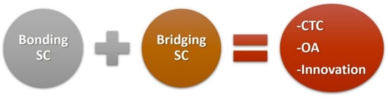 Cultural tourism clusters (CTCs) “entail engaging networks of collaborative and competitive relationships with other local companies, such as, for example, travel agencies, tour operators and institutions” (Sainaghi & Baggio, 2014 cited in [20], p. 1485). Moreover, Martinez-Perez, Garcia-Villaverde and Elche [20], explain that the connection among firms and tourists within CTC is particularly strong in historical and World Heritage Cities destinations due to the ability of these destinations to contribute to the development of social capital (SC). This ability is explained from the fact there is a strong connection between cultural heritage, identity and sense of belonging [20]. Putman (2000, cited in [20]) argues that SC puts together two opposites, namely bonding SC (Reciprocity and solidarity between individuals sharing similar characteristics) and bridging SC (connection from networks of different individuals) (Figure 1). As for Martinez-Perez, Garcia-Villaverde and Elche [20], they argue that bonding and bridging SC are complementary (not opposite) and source of innovation. Based on the preceded information, CTC could be related to OA as “CTC are able to drive the combination of bonding and bridging capital to develop a strategy from exploration and exploitation of knowledge simultaneously, this would achieve better results in innovation” ([20]: 1491).