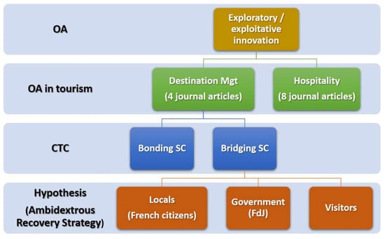 Based on preceded literature, this research paper is going a step further by inferring that within, a bridging SC strategy, can emerge groups that are often presented as heterogeneous. But when combined, the result is an Ambidextrous Recovery Strategy (ARS), which is a source of greater experience and benefits for all stakeholders involved within the cluster. More specifically, this research paper is arguing that by developing the lottery Mission Patrimoine, the French government has the opportunity to initiate a bridging SC strategy. On the one hand, associating local stakeholders, namely the local government and the local population; and on the other hand, visitors or tourists. This segmentation could also be depicted as providers of an experience (local populations and government) and recipients of a service (visitors or tourists). Or even as individuals (locals and tourists) vs government body (FdJ). The trinity locals, FdJ and visitors is made of partners belonging to different spheres, and therefore perfectly fits the characteristics of bridging SC defined by Putnam (2000 cited in [20]). In a nutshell, this study moves from the hypothesis that the different spheres generated within the bridging SC strategy of Mission Patrimoine are complementary rather than opposed dimensions. From this complementarity can emerge the topic of Ambidextrous Recovery Strategy (ARS). Figure 2 summaries the hypothesis and the related process.
