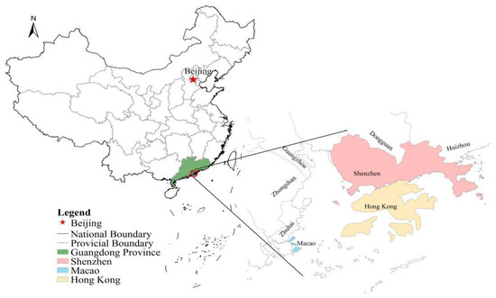 Shenzhen City is one of the four first-tier cities in China, the national economic center city, and the internationalized city positioned by the General Office of the State Council. It is located in the South of Guangdong Province, East of the Pearl River Estuary, separated from Hong Kong, East of Daya Bay and Dapeng Bay, West of Pearl River Estuary and Lingding Ocean, South of Shenzhen River and Hong Kong, and North of Dongwan City and Huizhou City. The city has a total area of 1997.27 square kilometers (Figure 1).