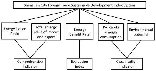 In the evaluation index system for constructing foreign trade sustainable development, the secondary indicators used in this research were: (1) Emergy dollar ratio, (2) environmental potential, (3) per capita emergy, (4) emergy benefit rate, and (5) the total emergy of import and export. We further categorized them into three primary indicators: (1) Comprehensive indicators, where the overall economic development is evaluated based on the energy dollar ratio and total energy of imports and exports. (2) Classification indicators, where the economy’s impact on the environment and people’s living standards is reflected in the per capita emergy consumption and environmental potential. (3) Evaluation indicators, where the degree of a country’s foreign trade development status is measured by the emergy input rate (Figure 2) [32].