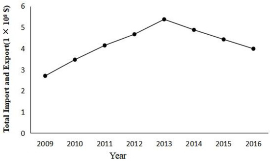 In our current study, the total emergy of import and export is a summary of the import and export emergy values of 22 industries. Changes in the total emergy of foreign trade from 2009 to 2016 are shown in Figure 8. The data show that, after a slow rise in 2009 to 2011, a sharp decline began, which indicates that foreign trade in Shenzhen City may be in an unfavorable state, and its fairness remains to be seen. This situation may be affected by the international economic environment.