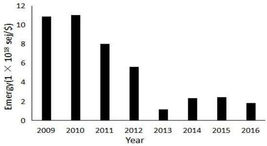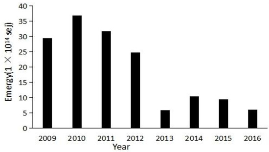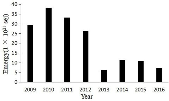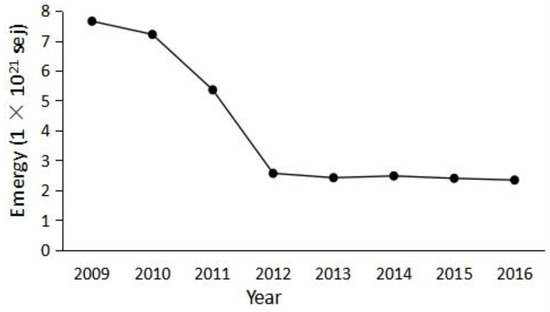 A comparative analysis of trade emergys for light and heavy industrial sectors can be made by comparing the emergys from 2009 to 2016 heavy industry trade, as shown in Figure 11.