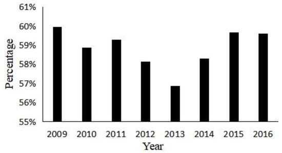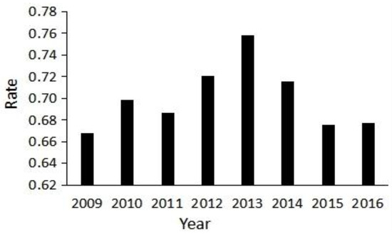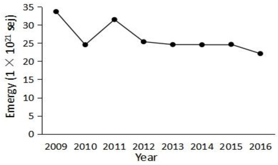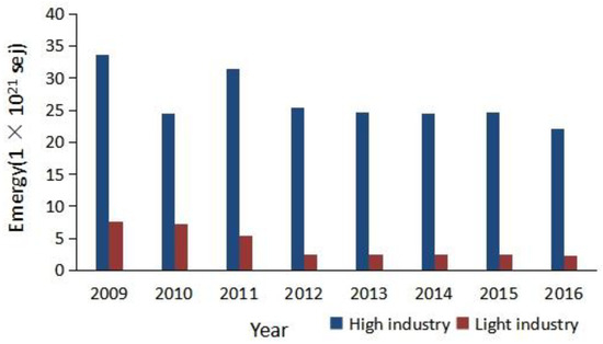 According to the light industry sector’s definition and classification, the trend chart of the young industry emergy consumption from 2009 to 2016 was made, as shown in Figure 10.