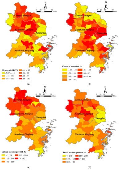 (a) Change of GDP. (b) Change of population. (c) Change of urban income growth. (d) Change of rural income growth (2000–2013).