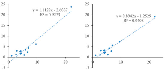 The linear approximation between population agglomeration and service level of higher education. (Note: The correlation coefficient (Pearson) between population agglomeration and Teachers in institutions of higher learning by city is 0.698, and that between population agglomeration and high-quality hospital is 0.664. All of them are significant at 0.01 level.) Data source: “China City Statistical Yearbook”, the Yangtze River Delta region of the national economic and social development statistics bulletin.