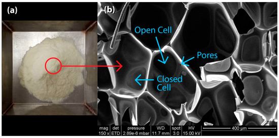 Figure 2. PFW (a) Ground polyurethane foam. (b) Cellular microstructure of rigid polyurethane, scale 400 μm.
