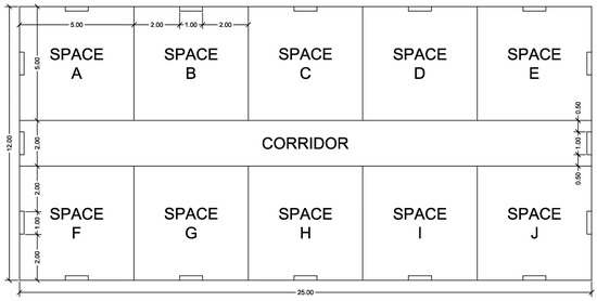 The living spaces are squares with a 5-m edge length. The six intermediate ones have a square window with a 1-m edge length. The four corner spaces have two façades, with one square window at each one. The corridors have a rectangular shape with dimensions of 25 m × 2 m. They have two façades, with a door on each one, with dimensions of 1 m × 2 m.
